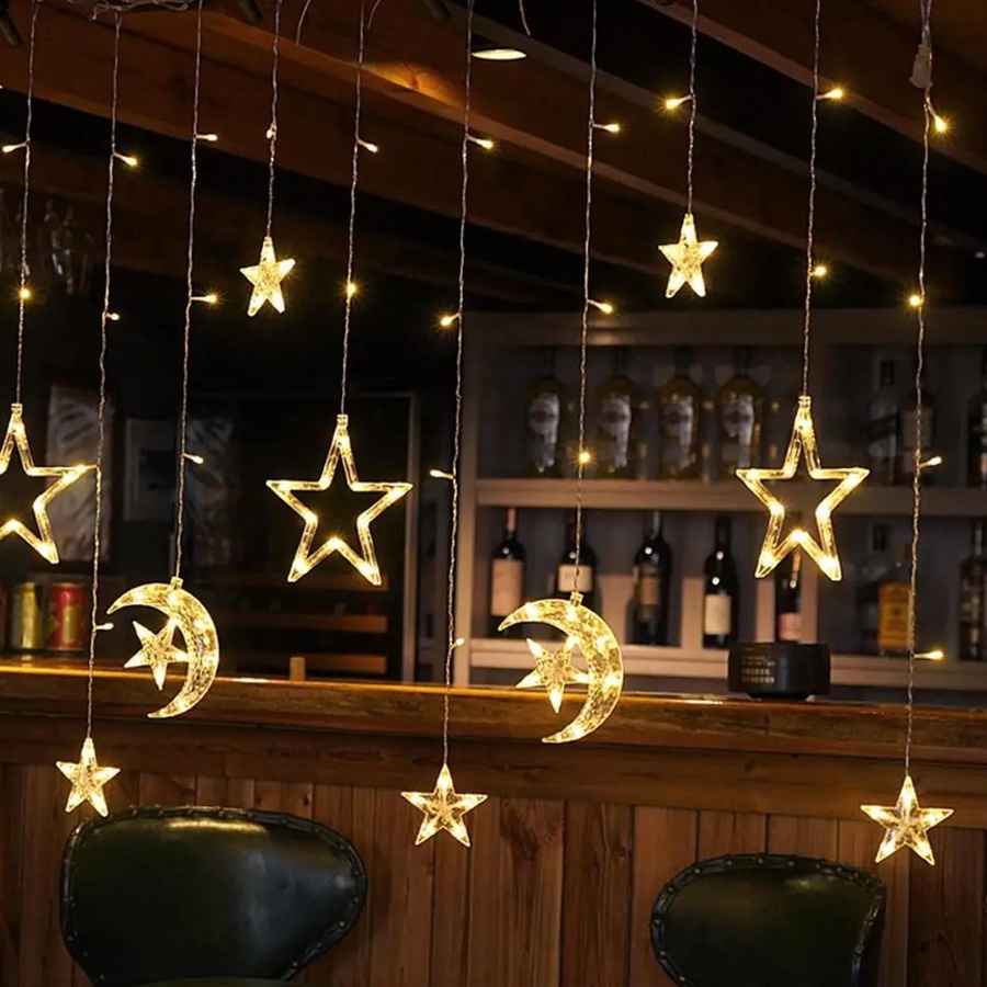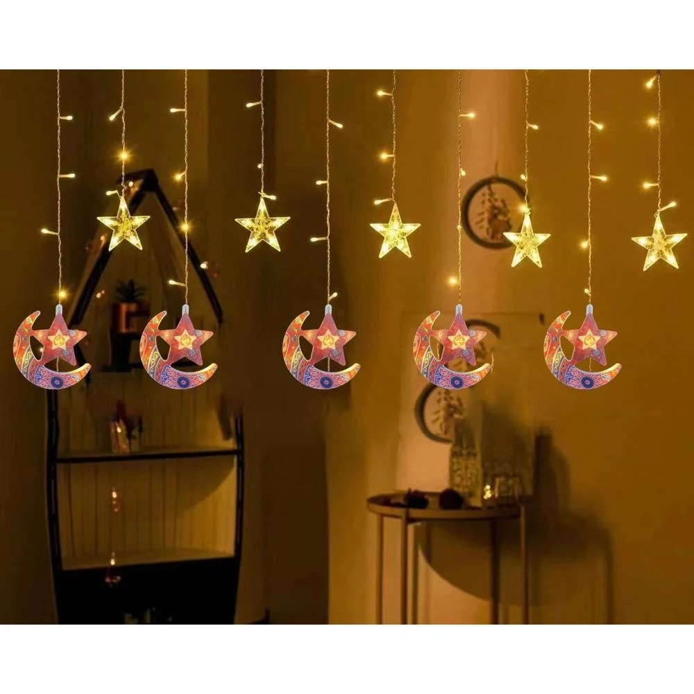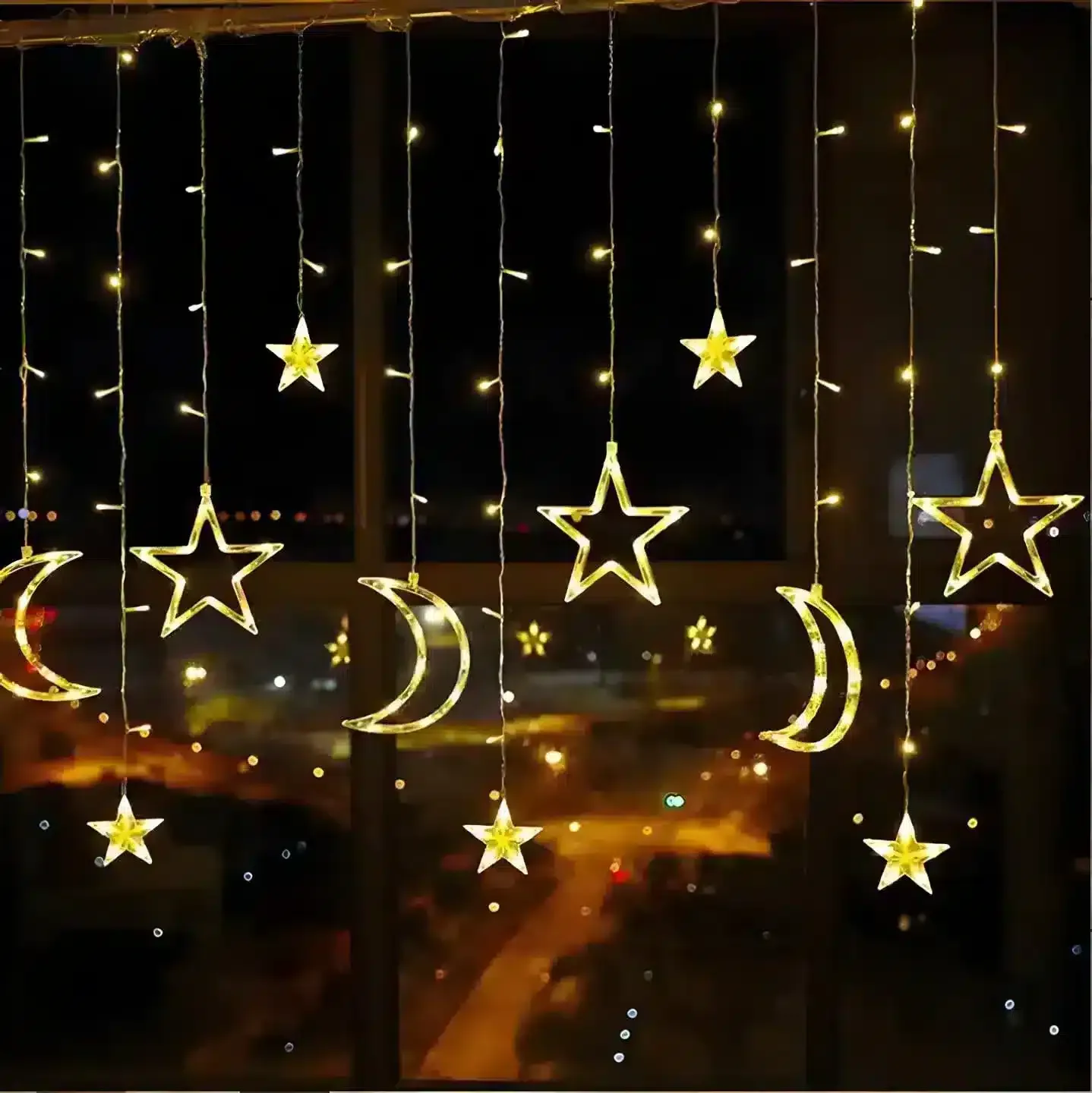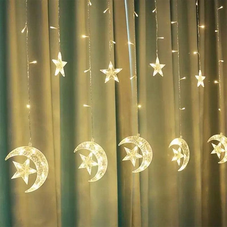 ✨🌙 أضف لمسة رمضانية ساحرة لمنزلك مع ستاره هلال ونجمة بطول 3 متر و6 أفرع 💡، لتزيين الغرف، الشرفات، وطاولات الإفطار بطريقة مبهرة وأنيقة. هذه الستارة الرائعة تضفي أجواء دافئة واحتفالية ❤️🕯️ على أي ديكور رمضاني.